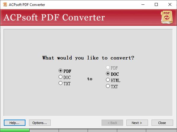 ACPsoftPDFConverter是一款PDF文档转换器,支持PDF,TXT,doc进行格式互转;这是一个简单并且免费的PDF格式转换器,用户可以使用它将PDF转换成易于编辑的doc文档,也可以将其转换成HTML文件,让用户可以通过浏览器查看PDF的内容;ACPsoftPDFConverter采用向导式的工作方式,用户可以按照提示选择转换类型,添加文件和处理文档等等;如果您需要大量的转换PDF文档,选择这款工具准没错,它可以导入保存PDF的文件夹并进行批量转换,并且转换速度飞快;需要的朋友欢迎下载。
